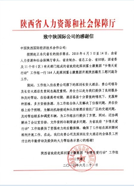 2010年6月5日至6月14日,陜西省有關(guān)部門(mén)組成的省政府赴深圳富士康“鄉(xiāng)情關(guān)愛(ài)行動(dòng)”工作組一行164人在深圳富士康集團(tuán)開(kāi)展陜西籍員工慰問(wèn)疏導(dǎo)工作,并入住我集團(tuán)所屬深圳長(zhǎng)安大酒店。在此期間,深圳長(zhǎng)安大酒店的領(lǐng)導(dǎo)高度重視,和酒店全體員工全力以赴,克服困難,認(rèn)真做好接待服務(wù)工作,為工作組在深圳的工作提供最優(yōu)質(zhì)服務(wù)和幫助,得到了工作組的高度贊揚(yáng)。工作組回到西安后,特別致函我公司表示衷心感謝。