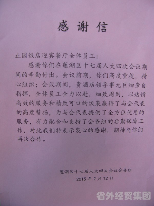 近日,蓮湖區(qū)兩會(huì)在止園飯店勝利召開(kāi)。近600位政協(xié)委員、人大代表以及工作人員下榻飯店,體驗(yàn)的同時(shí)也考驗(yàn)著我們的服務(wù)。兩會(huì)期間,飯店全體員工以熱情大方、細(xì)致入微的服務(wù)贏得了兩會(huì)代表、委員的一致好評(píng),4天內(nèi)共收到了表?yè)P(yáng)信4封,達(dá)到了領(lǐng)導(dǎo)放心、代表們滿意的效果,圓滿完成了“兩會(huì)”的接待服務(wù)工作。
