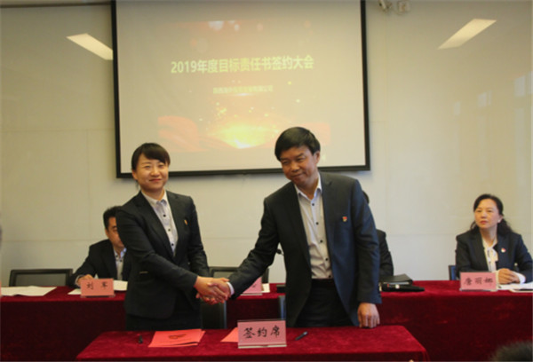 2019年3月18日,陜海投公司隆重召開2019年度目標(biāo)責(zé)任書簽約大會(huì)。公司黨委書記、董事長丁永忠,總經(jīng)理劉軍,黨委副書記、副總經(jīng)理?xiàng)詈疲o(jì)委書記韓雅萍,財(cái)務(wù)總監(jiān)唐麗娜以及公司全體職工出席了大會(huì),會(huì)議由黨委副書記、副總經(jīng)理?xiàng)詈浦鞒帧?