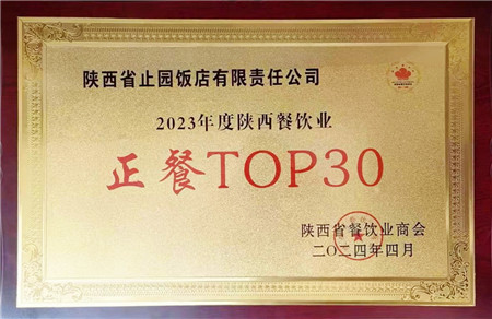 陜外集團止園飯店榮獲 “2023年度陜西餐飲業(yè)正餐TOP30”榮譽稱號