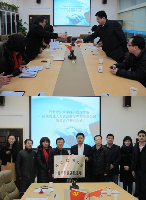 易通公司總經(jīng)理張少華、副總經(jīng)理艾斌、招聘培訓部部長閆杰等一行6人,于2013年1月7日前往西北政法大學南校區(qū)與該校經(jīng)濟管理學院,就簽訂校企合作協(xié)議進行溝通。西北政法大學經(jīng)濟管理學院劉院長、王副院長、趙副院長、學院輔導員王老師等5人出席了本次校企合作協(xié)議簽訂儀式。