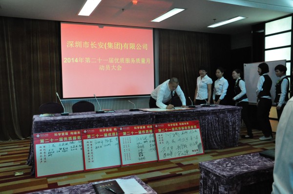 2014年9月12日,在歌聲、笑聲中,在各部經(jīng)理帶領(lǐng)部門員工簽訂優(yōu)質(zhì)服務(wù)承諾書的火熱氣氛和鏗鏘有力的宣誓口號聲中,長安大酒店第二十一屆優(yōu)質(zhì)服務(wù)質(zhì)量月活動(dòng)隆重拉開帷幕。