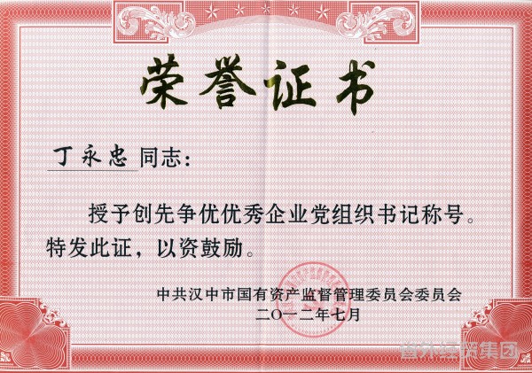 在建黨91周年之際,集團(tuán)所屬漢中市建筑工程總公司黨委書記、總經(jīng)理丁永忠同志被漢中市國(guó)資委黨委授予創(chuàng)先爭(zhēng)優(yōu)優(yōu)秀企業(yè)黨組織書記稱號(hào)。