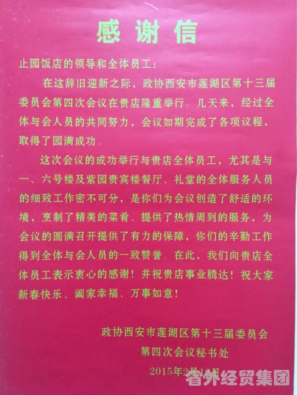 近日,蓮湖區(qū)兩會(huì)在止園飯店勝利召開(kāi)。近600位政協(xié)委員、人大代表以及工作人員下榻飯店,體驗(yàn)的同時(shí)也考驗(yàn)著我們的服務(wù)。兩會(huì)期間,飯店全體員工以熱情大方、細(xì)致入微的服務(wù)贏得了兩會(huì)代表、委員的一致好評(píng),4天內(nèi)共收到了表?yè)P(yáng)信4封,達(dá)到了領(lǐng)導(dǎo)放心、代表們滿意的效果,圓滿完成了“兩會(huì)”的接待服務(wù)工作。