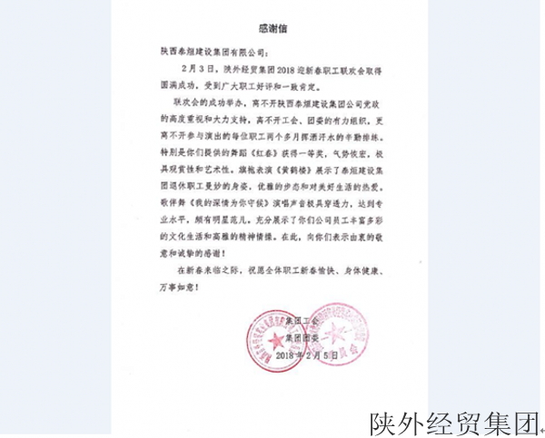 新年來臨之際,2月3日下午,陜外經(jīng)貿(mào)集團(tuán)公司舉辦“2018迎新春職工聯(lián)歡會(huì)”。漢中泰烜建設(shè)公司精心組織排練,選送了舞蹈《紅春》、歌伴舞《我的深情為你守候》、旗袍表演《黃鶴樓》三個(gè)節(jié)目。選送的節(jié)目大氣、震撼、充滿正能量,充分彰現(xiàn)了漢中泰烜公司職工積極向上的精神風(fēng)貌和公司發(fā)展蒸蒸日上。經(jīng)過集團(tuán)現(xiàn)場(chǎng)評(píng)委量化評(píng)分,舞蹈《紅春》獲得一等獎(jiǎng),歌伴舞《我的深情為你守候》獲得二等獎(jiǎng),旗袍表演《黃鶴樓》獲得三等獎(jiǎng),漢中泰烜公司獲得優(yōu)秀組織獎(jiǎng)嘉獎(jiǎng),同時(shí)得到集團(tuán)工會(huì)、團(tuán)委的感謝信表?yè)P(yáng)。本次聯(lián)歡會(huì)漢中泰烜公司黨政工高度重視和大力支持,精選職工組織大家辛勤排練,通過大家的共同努力,演職人員載譽(yù)而歸。