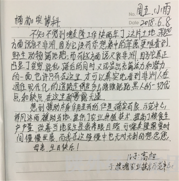 想到援助本身作用是有的,但也是有限的,示范中心櫛風(fēng)沐雨援助當(dāng)?shù)?,提供了先進(jìn)的農(nóng)業(yè)種植技術(shù)、提高了的糧食產(chǎn)量,改善了當(dāng)?shù)孛裆俏矣H眼目睹,可喀麥隆需要時間慢慢發(fā)展,而我在這漫漫中也無時不刻地想念您。