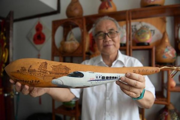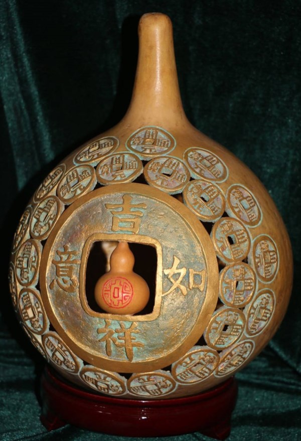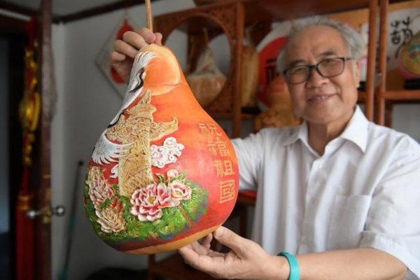 在喜迎新中國(guó)成立70周年日子里,梁平安把對(duì)祖國(guó)的祝福在葫蘆上表現(xiàn)出來,祝祖國(guó)繁榮富強(qiáng),人民幸福安康。